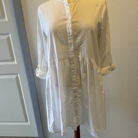 ONLY Hverdagskjole i størrelse 36, farven hvid, lavet af bomuld. Kjolen har lange ærmer og knaplukning foran.