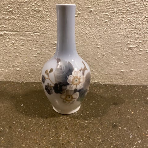 Royal Copenhagen 1. Sortering porcelæns miniature Vase med blå glasur og hvid blomst. Mærke nr. 353/396. Højde 10,5 cm, velegnet som dekorativ