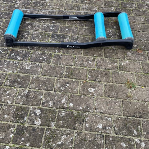 Tacx Antares træningsrulle med blå støttepuder. Designet til indendørs cykeltræning og opvarmning. Ramme i sort farve med justerbar højde.