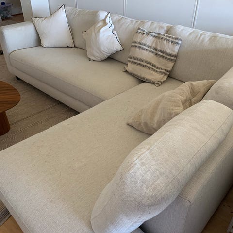 Sofa er 260x260. Alle puderne er løse og betræk kan skiftes/vaskes.