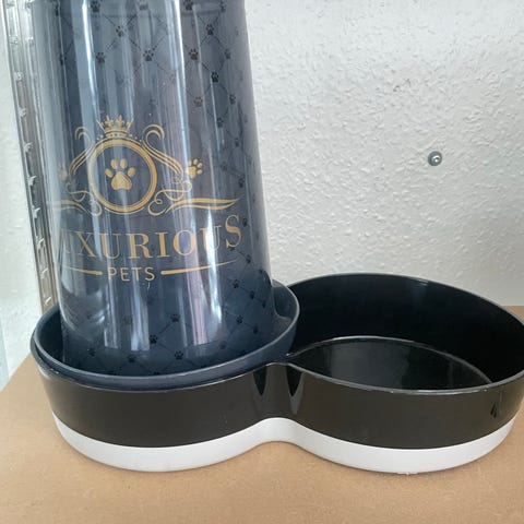 Rojeco Automatisk Foderdispenser til kæledyr med digitalt display og timerfunktion. Enheden er sort og inkluderer en foderskål samt brugervejledning. Designet til at give præcis portionering af tørfoder til kæledyr.