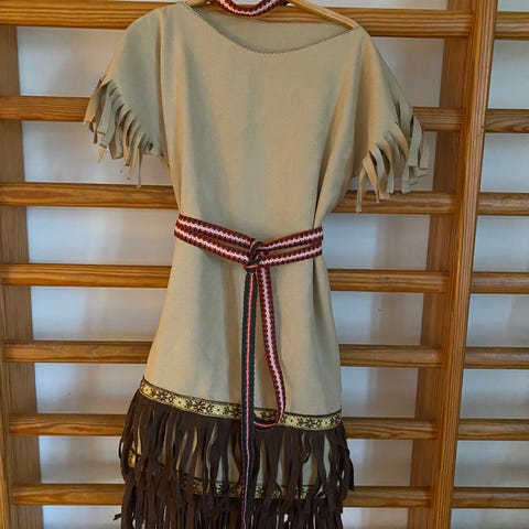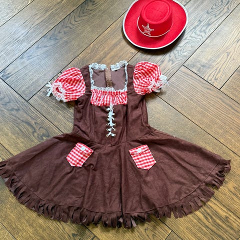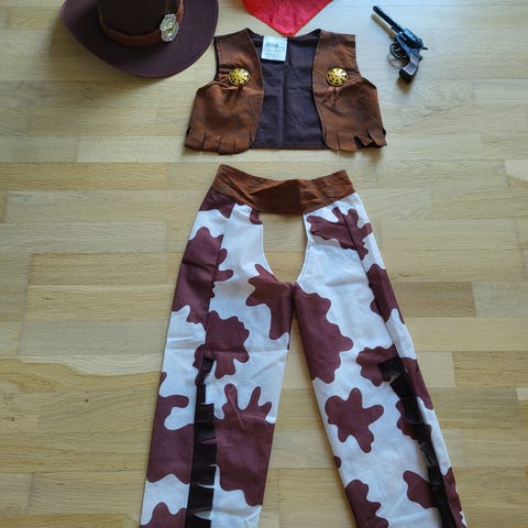 Fint cowboy kostume sælges . Det er aldrig brugt . Det består af bluse - bukser og tørklæde . Det er i str 4-6 år . Det sælges for 75kr