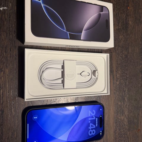 Apple iPhone 16 Pro smartphone med 512 GB lagerplads. Enheden har en hvid bagside og et kamera med tre linser. Designet til at give høj ydeevne og stor lagerkapacitet.