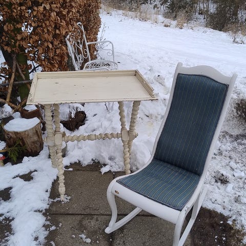 Lille gyngestol/ / vippestol, Sød lille vippestol / gyngestol med blå og hvidstribede stof. 58 x 32 x 44 cm.