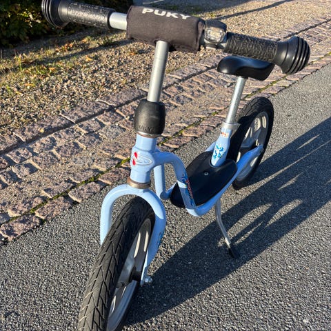 Fin 10" PUKY Løbecykel i blå farve. Cyklen er designet til børn og har et justerbart sæde og styr for tilpasning efter barnets størrelse. Den har robuste hjul uden pedaler, som hjælper med balance og koordination.