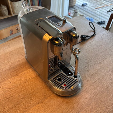 Fin Nespresso maskine, der virker som den skal. Vi har løbende afkalket den og den er afkalket og testet igen dags dato (15.12.2025). Maskinen er ca. 3-4 år gammel, men har ikke været brugt de sidste 1,5 års tid grundet køb af større espresso maskine. Afhentes eller sendes på købers regning