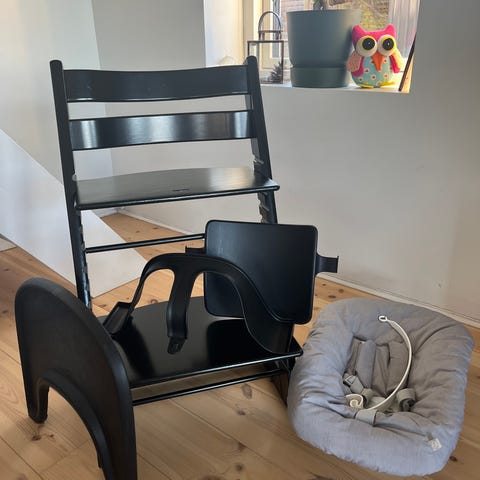 Gennemrenoveret, hvid trip trap stol (ny model). Med hvid plastindsats og newborn indsats.