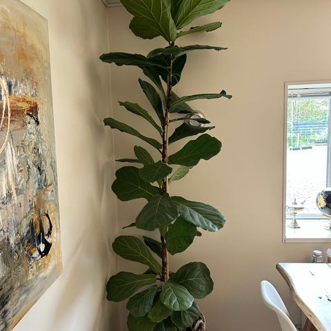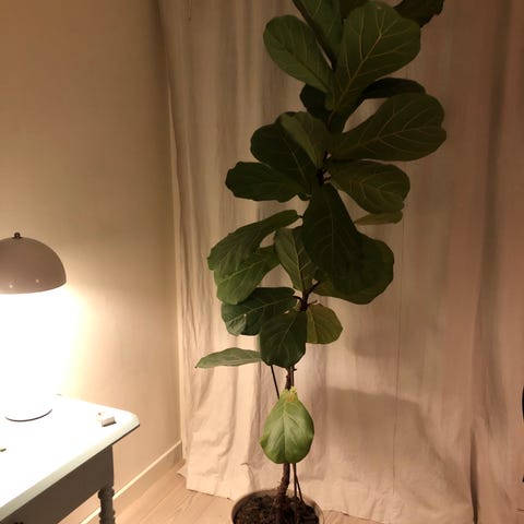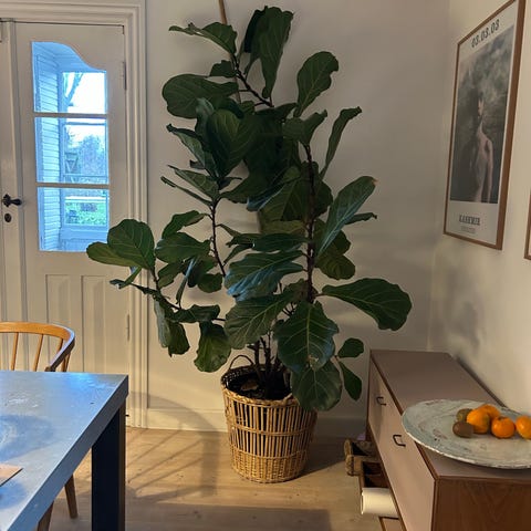 Violin figentræ stueplante med store grønne blade placeret i en sort potte. Planten er egnet til indendørs brug og kan bidrage til indretning med naturligt grønt element.