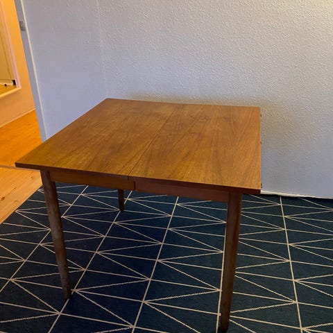 Charmerende blåmalet spisebord med udtræk i begge ender. Der følger ikke udtræksplader med. Udtrækket er 29 cm.