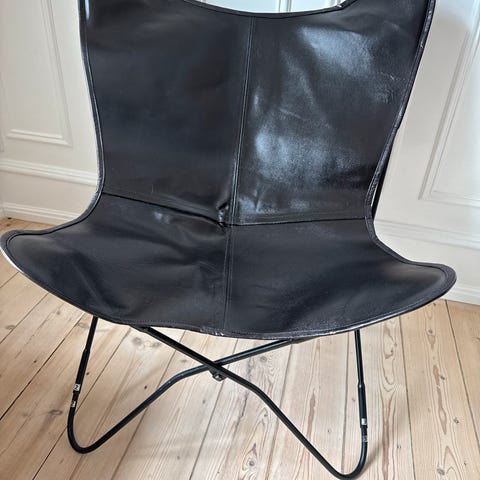 Flot sommerfugl eller flagermus stol i sort stel. Betrækket er brunt læder, som har fint patina.