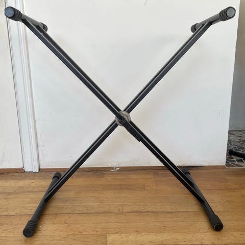 Sort keyboardstativ i metal med justerbar højde. Designet til at støtte forskellige størrelser af keyboards og let at folde sammen for transport og opbevaring.