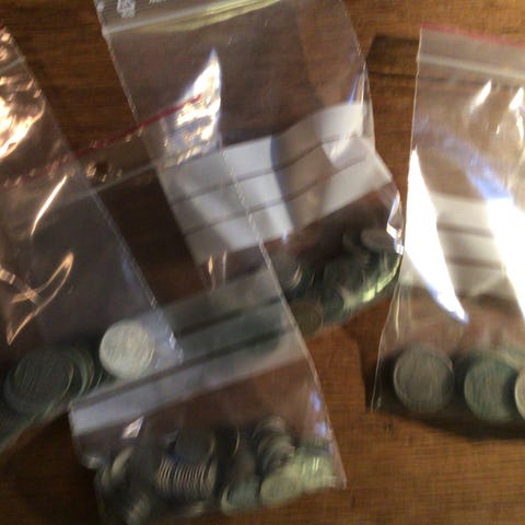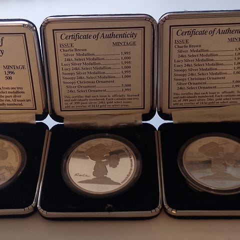 Samling af 12 sølvmønter opbevaret i en mørk opbevaringsæske med individuelle rum til hver mønt. Mønterne varierer i design og størrelse og er arrangeret i tre rækker. Æsken har en poleret træramme og blå indvendig foring.