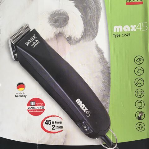 Moser Max 45 hårklipper med tilbehør inklusive kamme og olie. Produktet er designet til præcis klipning og har en ledning for strømforsyning.