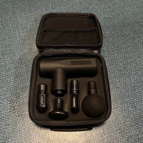 MusclePain MassageGun Pro massagepistol med 5 forskellige massagehoveder og en bæretaske til opbevaring.