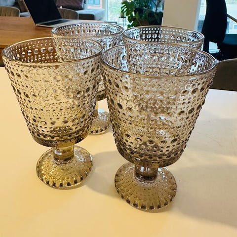 Iittala Kastehelmi store opbevaringsglas i gråt glas med låg. Glasene har et dekorativt mønster af dråber. Velegnet til opbevaring af madvarer eller andre småting i køkkenet. Jeg har to glas. Prisen er 200 kr. pr. glas. 300 kr. samlet.