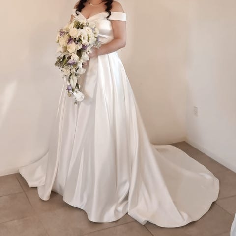 Mælkehvid brudekjole i størrelse S-M med lange ærmer, er perfekt egnet til, hvis man er tildækket. Den vil passe til en kvindehøjde på 155-165. Den er specielt syet hos Karim Design og har kostet ca. 15.000. Der er vedhæftet billede af design og målene.