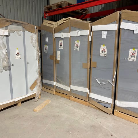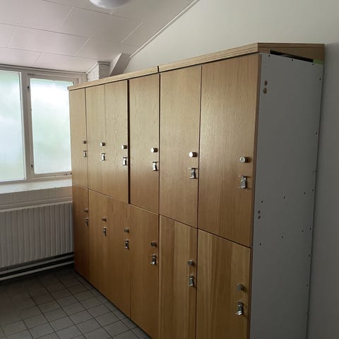 Omklædningsskabe med 6 låger pr. Skab. Låses med hængelås. Pris pr. Skab.