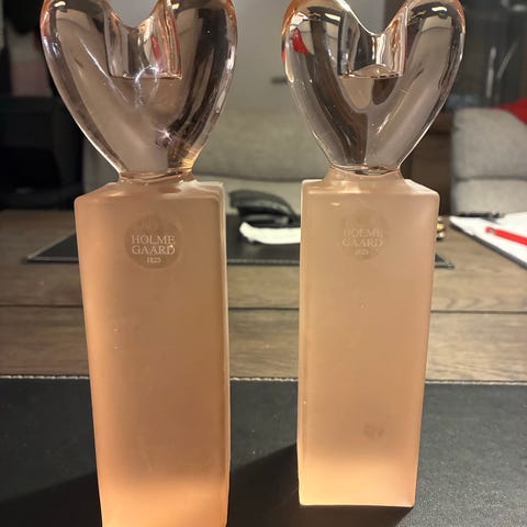 Holmegaard Glas Hjerte Dekoration i klart og frostet glas. To forskellige designs, hver med et hjerte på en firkantet base. Velegnet som dekorativt element i hjemmet.