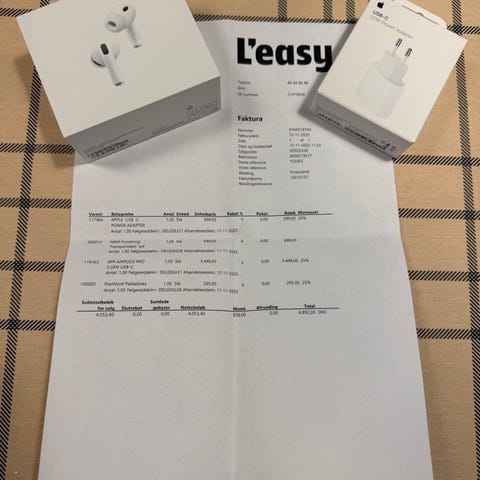 Kvittering fra Apple (købt i eget navn) & AppleCare+ Dækningsbevis, sendes som købers ønske det på SMS eller mail, når handlen er gennemført via Fiks Færdig - er klar til afsending