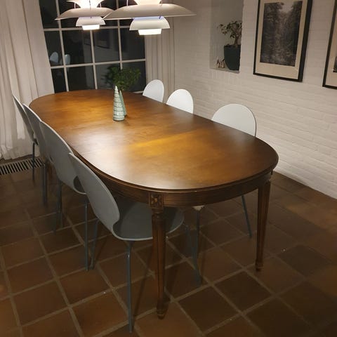 Gangsø spisebord, massiv kirsebærtræ. Magasin og udtræk m. to plader (malet og med farvepletter) 00 kr.
