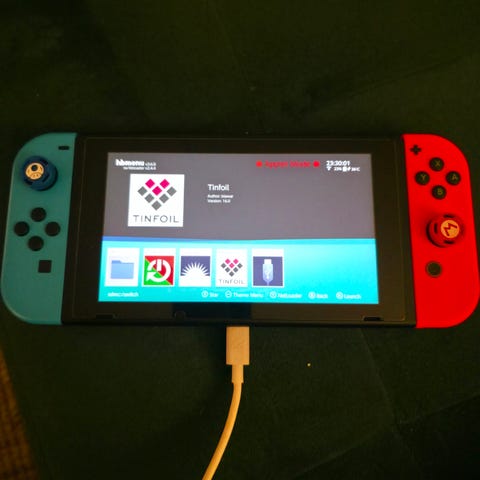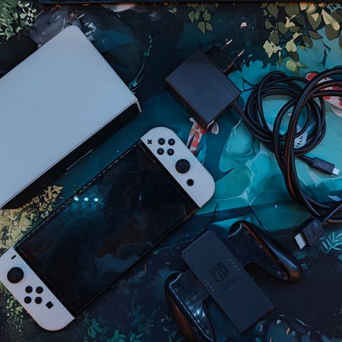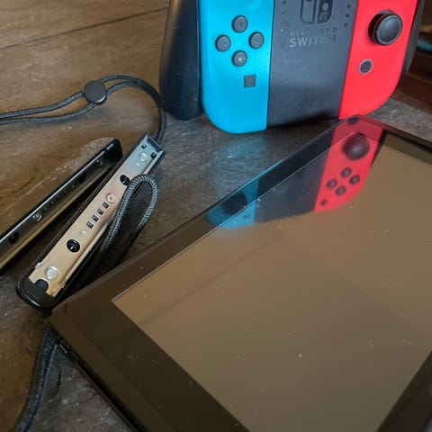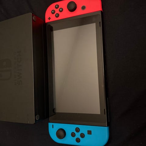 Nintendo Switch konsol med tilbehør inklusive dock, oplader, HDMI-kabel, Joy-Con controllere i rød og blå, håndgreb og opbevaringsetui. Skærmen har beskyttelsesfilm på. Spil medfølger ikke.