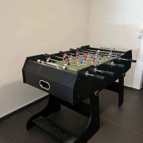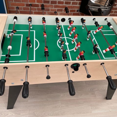 Rigtig sjovt bordfodboldbord med to holdfarver og 5 bolde. Det er velegnet indendørs brug men kan også bruges i haven eller på terrassen om sommeren. Perfekt julegave.