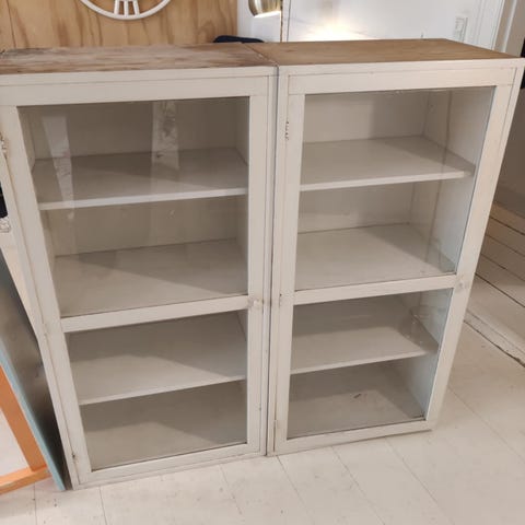 Skabet er meget tungt. Solidt og god kvalitet i træ og glas. Stilen er vintage/shabby chic.