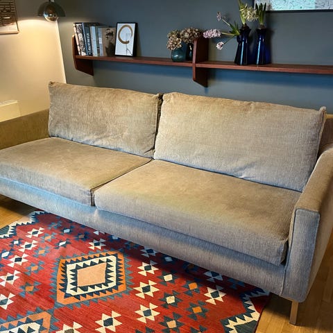 Eilersen sofa, ca. 7 år, blå velour i slidstærk familiekvalitet. Speciallavet i kun 3 moduler, i modsætning til flere moduler, dvs. færre ‘revner’ (mellem moduler)). Fyld i både sidde- og ryghynder er dun i høj kvalitet, som kan bankes op. Betræk på sidde- og ryghynder kan tages af (og renses). Det er blevet renset en gang i mellem. Sofaens betræk er brugt og slidt. Et hjørne er slidt (se foto) ligesom stoffet er bleget af solen. Men selve puderne, som alle kan bankes op, fejler ikke noget. Selve sofaens konstruktion er også fin. Pris dengang 90.000 - i dag over 100.000 (ligesom man ikke kan få så store moduler længere). Det er en rigtig god sofa, som vi har været meget glade for, men nu er det tid til noget nyt. Afhentning i januar. BYD - sælges til højeste bud i slut dec. / primo januar. Alle bud er velkomne.