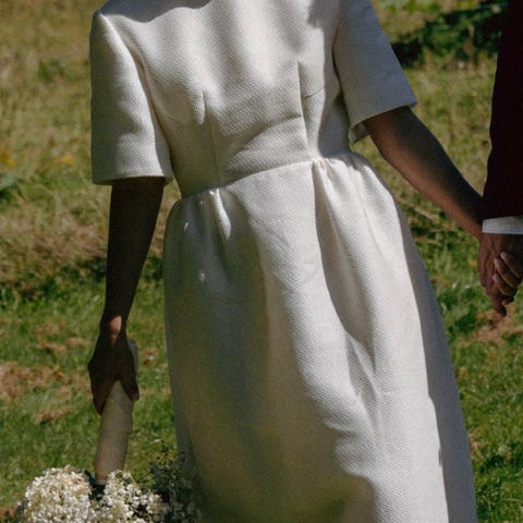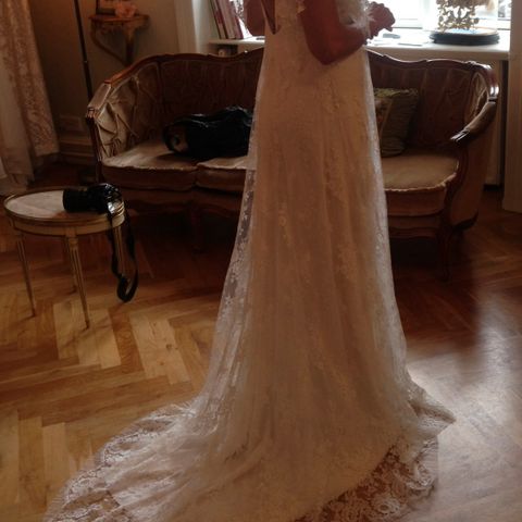 Brudekjole to delt i crem og små roser , med finger holder i underdel og kun brugt en gang . Er kosage og underdelen med flot slæb kan ikke skrive alle stof tuber og