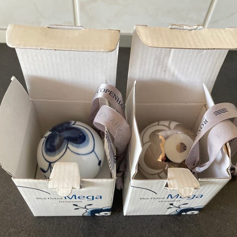 Har tre styk julekugler i Royal Copenhagens mega serie med blå streger på hvid bund.