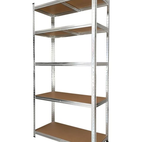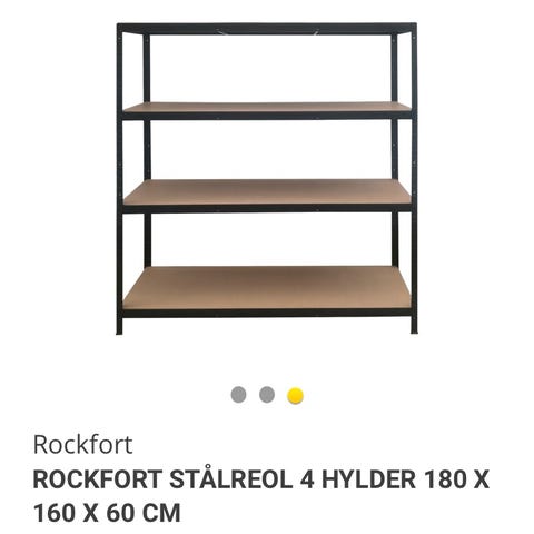 Rockfort stålreol med 4 hylder. Kan bygges sammen på to måder, så den enten måler H 180 x B 160 x D 60 (som på billederne) eller H 90 x B 320 x D 60 cm. Maks. belastning pr. hylde er 300 kg. Hylderne er af 6,8 mm MDF og har hver en maks. belastning på 300 kg.