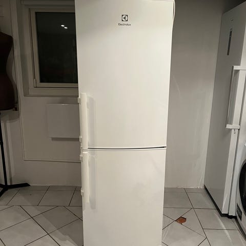 Electrolux køle-fryseskab med kombineret køle- og frysefunktion. Produktet er hvidt og har separate rum til køling og frysning med flere hylder og skuffer til opbevaring.