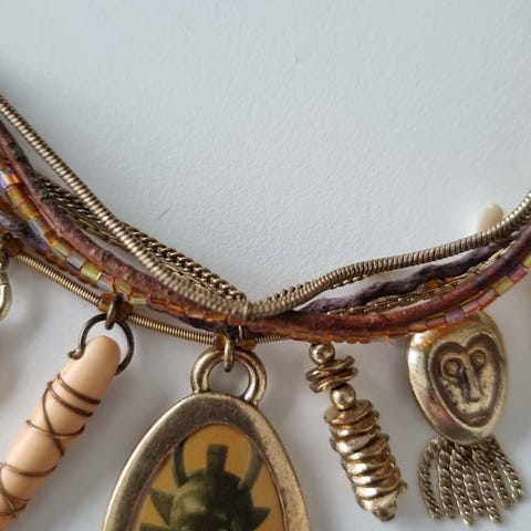 Kæde ca 50,5 cm, justerbar længde, et øje, og 4 metalknopper på kæde hvorlukningen kan sættes