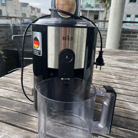 Sort saftpresser / juicer fra Braun, Type 4293 J500, med lille kande til saften.
