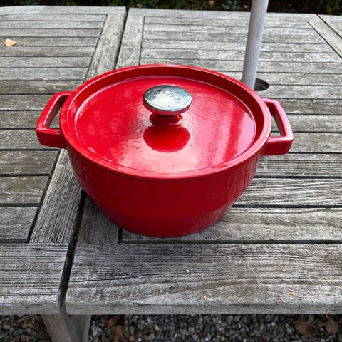 Flot gryde som helt ny. Rød. 25 cm i dia. Og 13 cm høj.