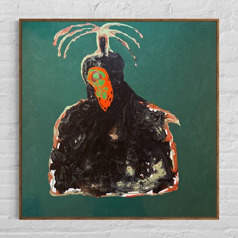 Abstrakt maleri på lærred med dominerende farver i rød, blå og grøn. Kunstværket har en markant tekstur og et unikt motiv, der kan anvendes som dekorativ vægkunst i hjem eller kontormiljøer.
