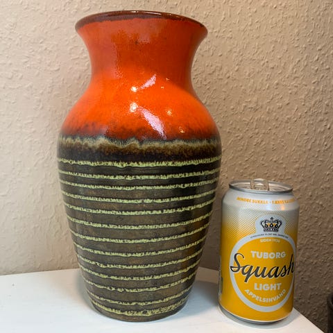 FLOT stor og sjælden West Germany vase fra Überlacker Keramik. Fin klassisk form på en rund for med kort hals og bred åbning. TOP relief decor på hele vasen og FLOT mat og blank lavaglasur i fine orange, grønne, sorte, blå og brune farver. TOP samler retro,,,,,!! Vasen er uden skader eller skår.