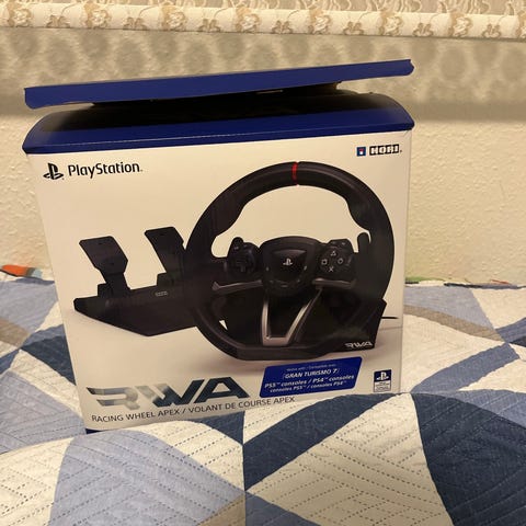 PlayStation Racing Wheel og Pedaler til spil med rat og to pedaler. Sort farve, designet til at give realistisk køreoplevelse ved bilspil.