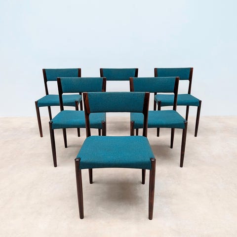 Stolene er udført i massivt palisander med smuk, dyb åretegning og har den karakteristiske lette og elegante form fra dansk mid-century design.