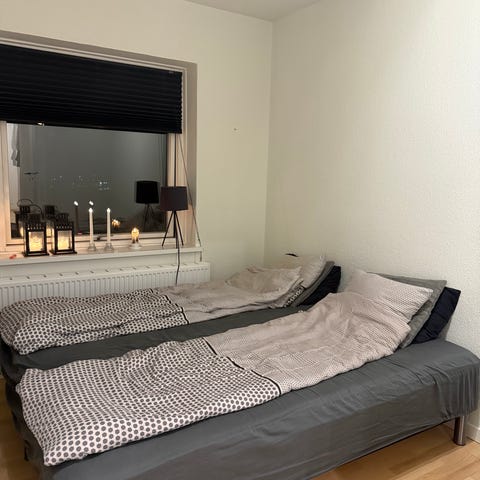 Boxmadrasser og topmadras er købt i jysk i 2024, rullemadras og lagner kun få måneder gamle.