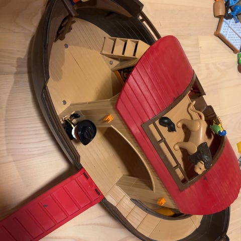 Playmobil legetøjsbåd med tilbehør inklusive figurer og mindre fartøj. Båden er designet til leg og har detaljer som rat, kikkert og redningsudstyr. Velegnet til børn til fantasifuld leg.
