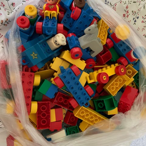 DUPLO figurer (6), dyr (8), køretøjer (4), spec. elementer (10) og klodser (160+), samlet i plastkasse.