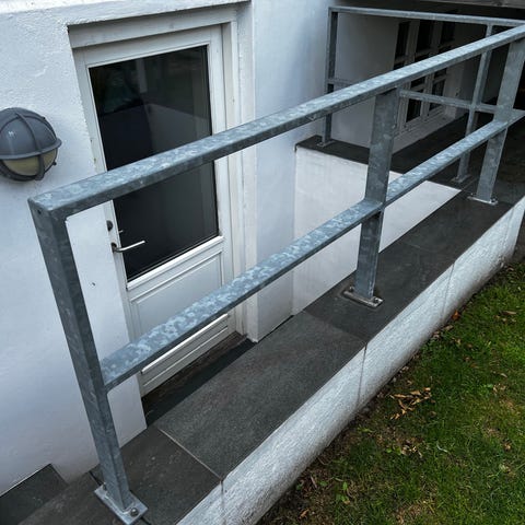 Længde ca. 365 cm. Gelænder til trappe med 5 flotte og solide beslag i væggen.
