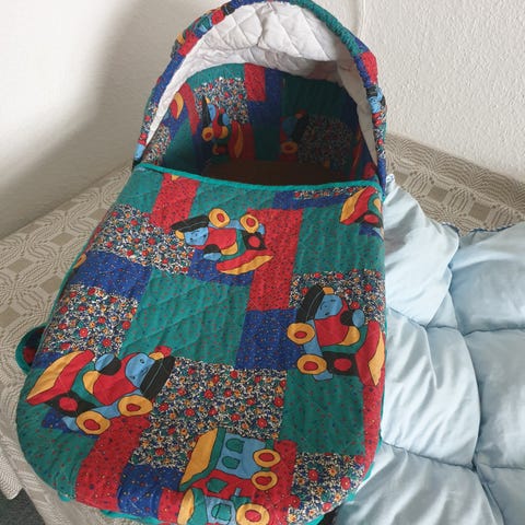 Den står pæn, ren og klar til brug – perfekt både til barnevognen og som en tryg soveplads indendørs.