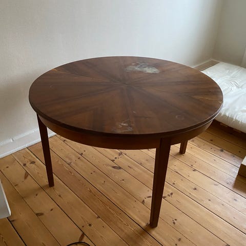 Bordpladen er tung og skal bæres ned fra 2. sal. Bordbenene er taget af og det er nemt at samle igen.