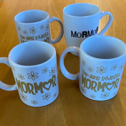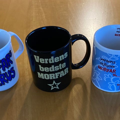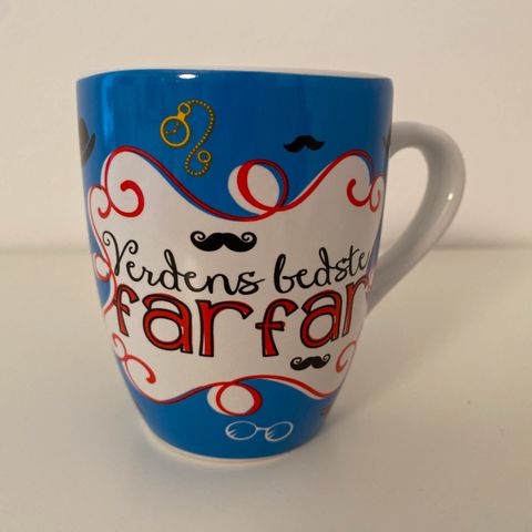 fint krus i mørkeblå glasur porcelæn krus med tekst ´´MORFAR´´ str. 8½ x 8, Ø cm, kan hentes for 10 kr.
