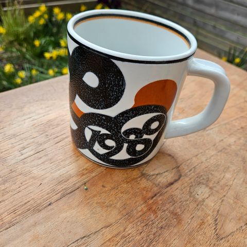 Royal Copenhagen Fajance krus med dekorativt sort og orange mønster.