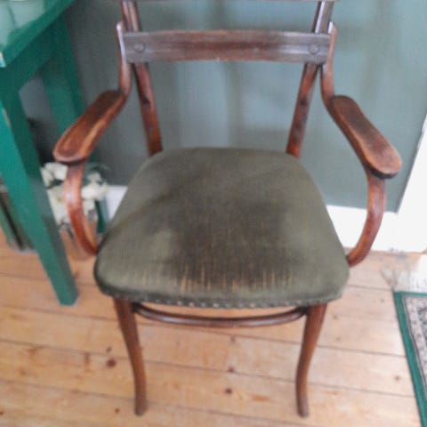 Materialer: Bøgetræ bukket i form (rosentræfarvet og håndpoleret med shellak), messing, stof ("Aristide", design: Otto Prutscher, Wien omkring 1905)
