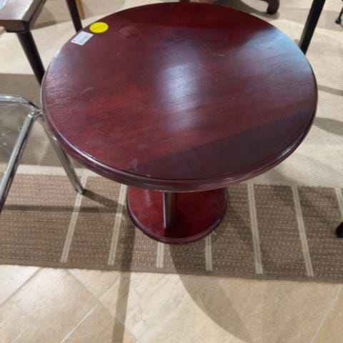 Rundt bord med en mørk træplade og kraftig pedestalbase. Klassisk design.,Afhentes i:,Røde Kors Kolding (621),Bemærk at mail, chat og beskeder ikke besvares, og varen skal købes på knappen "Gå til varen"