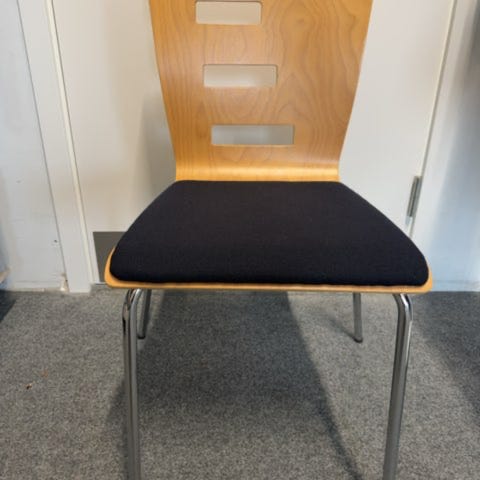 Stolen har en blød, kurvet ryg og en enkel, moderne form. Den er fremstillet af laminat og har metalben. Stolen er malet grågrøn.